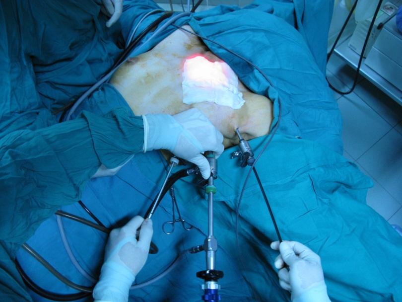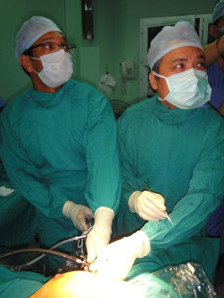 Figure 5: Endoscopic thyroid surgery through the armpit. The author learnt this technique from Prof Luong (right) who is a leading authority on this approach