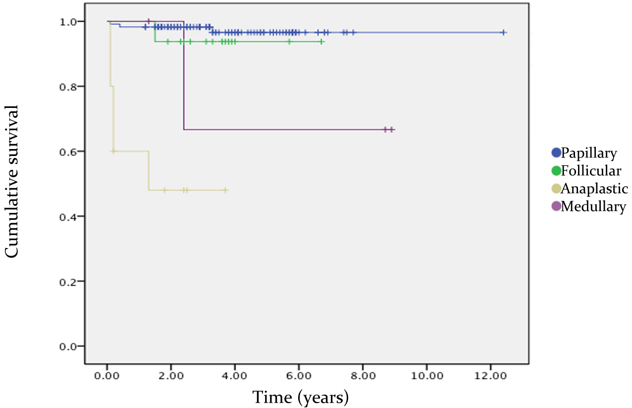 a 10 year review of thyroid cancer at the author’s institutional practice. The average follow up period was 42 months. Survival was poorer for the less favourable sub-types such as Medullary and Anaplastic thyroid cancer